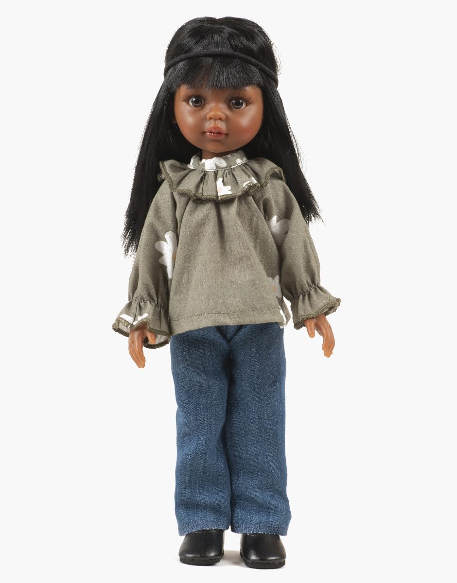Ensemble Sara avec blouse à collerette en coton imprimé et pantalon jean pour poupées Amigas 32cm.