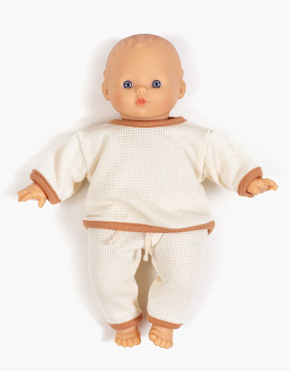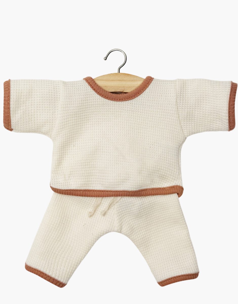 Ensemble 2 pièces jog Cocoon en nid d’abeille avec colletage écru pour poupées et poupons Minikane Babies 28cm.