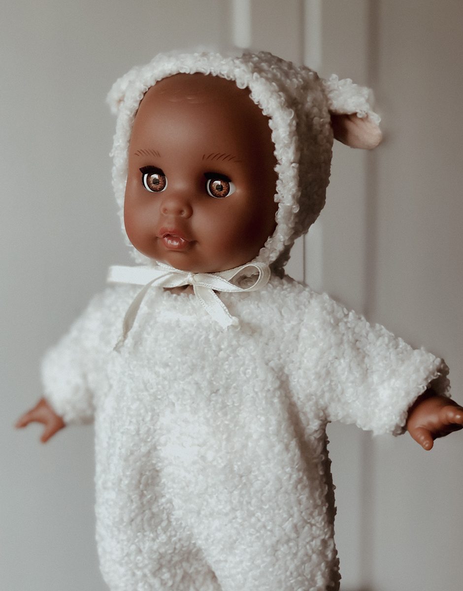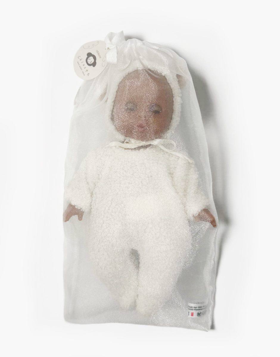 Céleste, poupée exclusive Minikane 26cm à corps mou et avec yeux dormeurs marrons, vendue habillée dans son pochon en tissu Organza blanc.