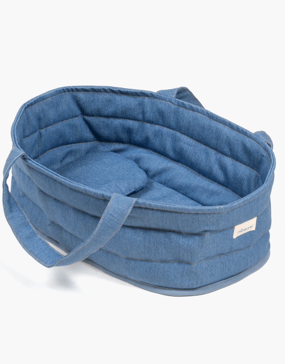 Couffin et son oreiller en denim ouatiné avec anses pour poupées et poupons Minikane Babies 28cm, Gordis 34 & 37cm et Cuties 36cm.