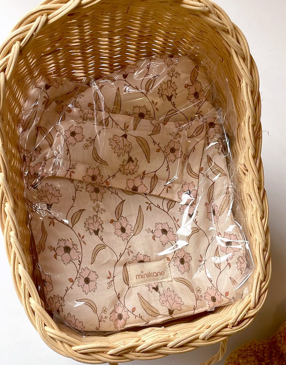 Poupée Peque 21cm Greta et sa combinaison Winnie en bouclette beige avec landau en osier.